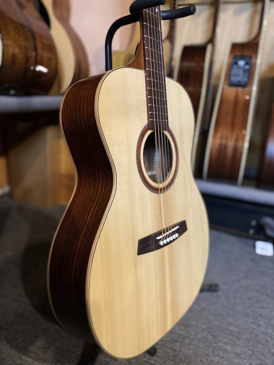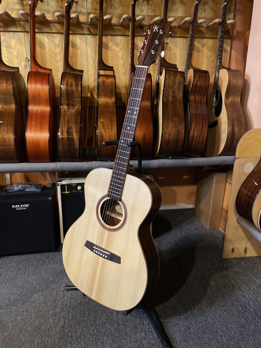 Оркестровая акустическая гитара европейского производства. Верхняя дека из массива ели и палисандровый корпус дают мощное пробивное звучание, отличный резонанс и сустейн. Порожки Tusq, наборная деревянная розетка и мягкая приятная работа фирменных колковых механизмов.