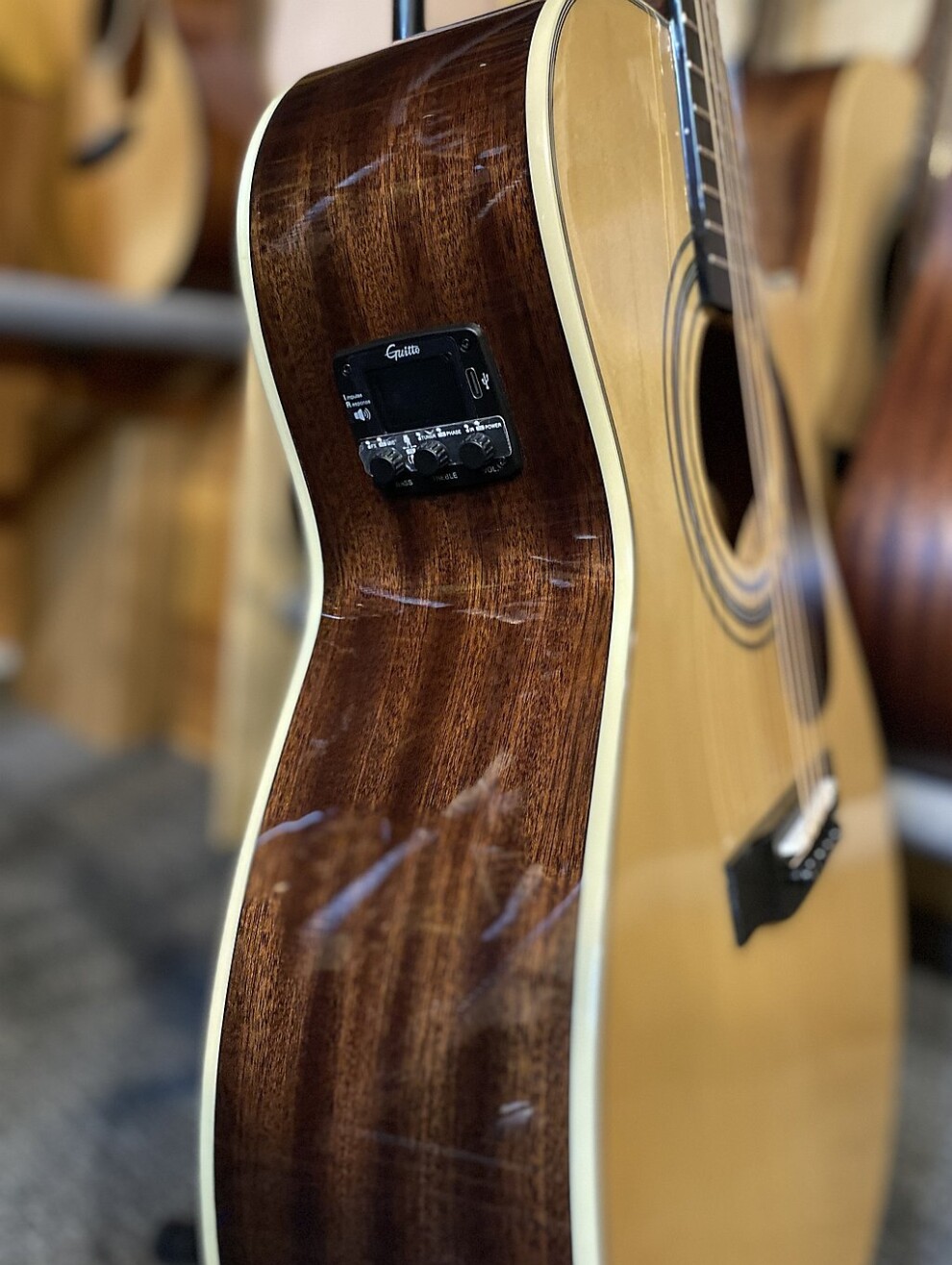 В гитару установлен звукосниматель Guitto GGP-04 со встроенным динамиком и процессором эффектов с IR-импульсами. Получилась отличная трансакустика.