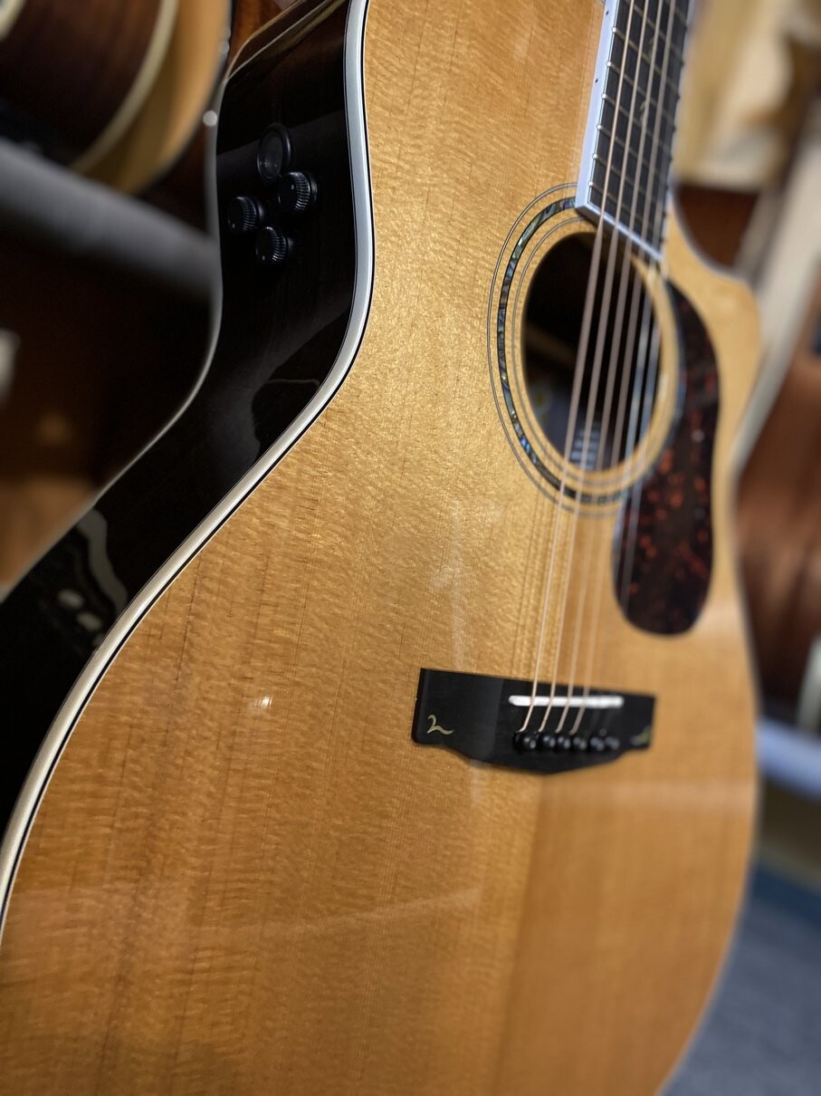 Корпус гранд-аудиториум сочетает в себе преимущества фолк-гитары и более объемного инструмента за счет большей ширины обечайки. Он пользуется большой популярностью среди гитаристов, играющих в стиле фингерстайл. Инструмент оснащен самой современной электроникой Fishman Flex Blend с пьезодатчиком и микрофоном, что дает возможность передавать очень живой звук гитары, применяя любые перкуссионные приемы.