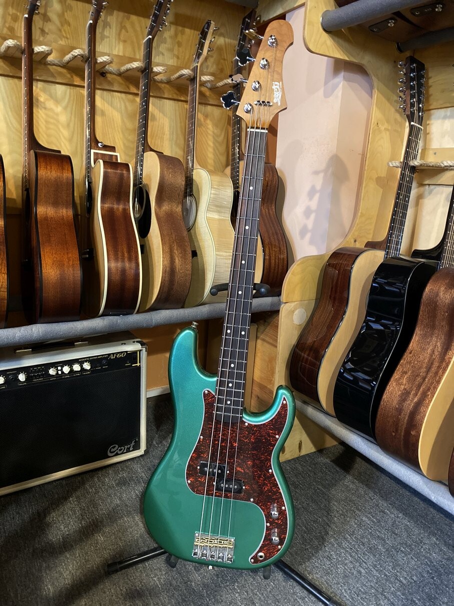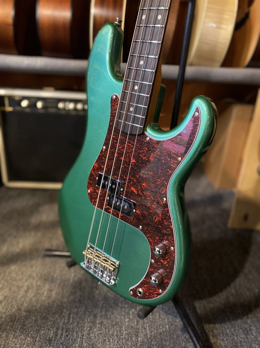 JET JPB-300, окрашенный в роскошный зеленый цвет, изготовлен с корпусом из печеного тополя, грифом из запечённого клена и накладкой на гриф из палисандра.