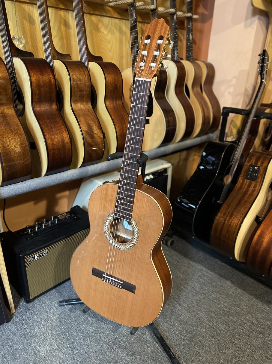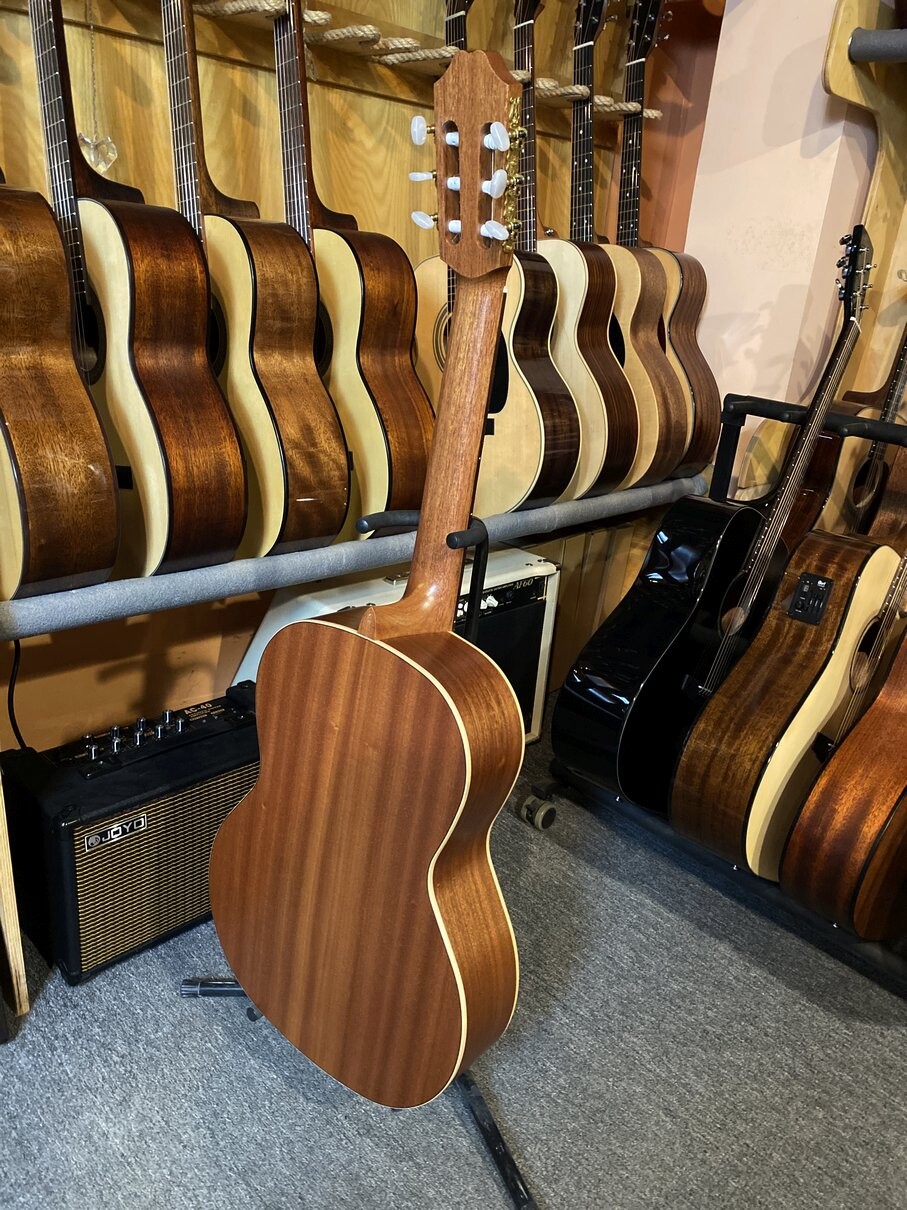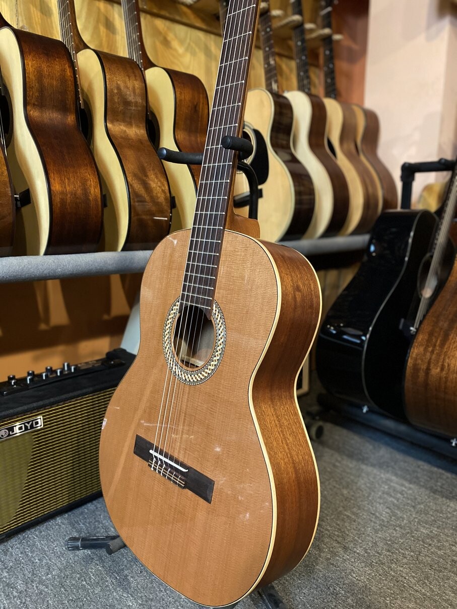 Классическая гитара с декой из массива красного кедра. В сочетании с корпусом из сапеле получился довольно громкий плотный и мягкий звук.