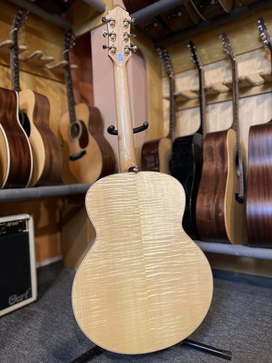 Инструмент очень красиво сделан. Задняя часть из светлого волнистого клена, фигурные инкрустации ладов и головки грифа, открытая колковая механика, струнодержатель необычной формы, ремнедержатели. Комплектуется фирменным утепленным чехлом.